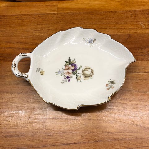 Royal Copenhagen porcelænfad med blomstermotiv. 23 x 18 cm. Ingen skår og guldkanter pæne. Fadet er formet som et blad med hank og har præget mønster langs kanten. Dekorationen består af flerfarvede blomster i midten og mindre blomsterdetaljer. Undersiden er mærket med Royal Copenhagen stempel og malersignatur. Velegnet som serveringsfad eller dekorativt indslag i borddækning og indretning.