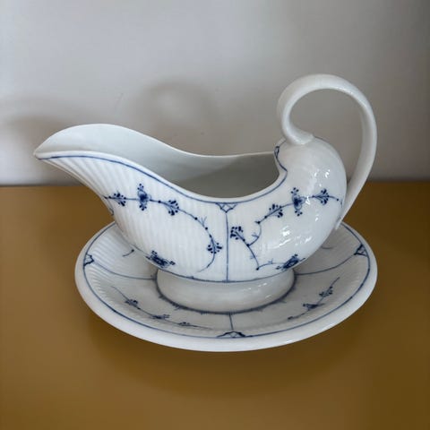 Royal Copenhagen musselmalet sovseskål med fast underfad i porcelæn. Klassisk hvid bund med blå dekoration og karakteristiske hankdetaljer. Egnet til servering af sauce og andre flydende tilbehør ved borddækning. Designet passer sammen med øvrige dele i musselmalet stel fra Royal Copenhagen.
