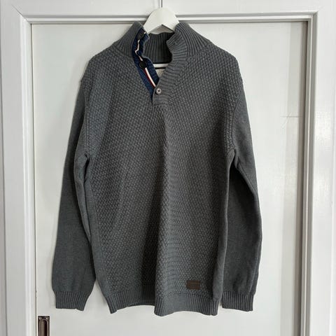 Super flot og velholdt kortærmet strik-polo fra Lindbergh i en dyb mørkeblå farve. Den har et klassisk mønster (cable knit) foran og gennemgående knapper, så den også kan bruges åben over en t-shirt.