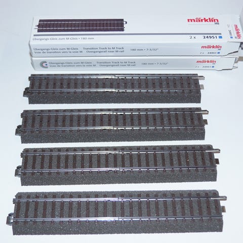 MÆRKE: Märklin K-skinner. 2 stk 2291 overgang K til M skinner. Samt 1 stk. 2231