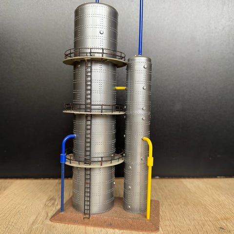 Model af atomkraftværk 1/87 HO med fejl og mangler,brugt på bane,sælges som defekt. bestående af flere bygninger og en køletårnsstruktur. Elementerne er udført i plast i hvid og blå farve og står på separate plader. Modellen kan anvendes som demonstrationsmodel, dekoration eller til undervisningsbrug, hvor der ønskes en visuel fremstilling af et kraftværksanlæg med reaktorbygning, køletårn og tilhørende bygninger.k