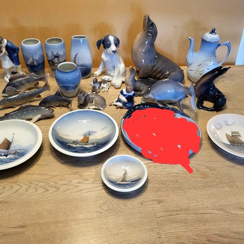 Bing & Grøndahl og Royal Copenhagen porcelænsfigurer og vaser i hvid og blå porcelæn.