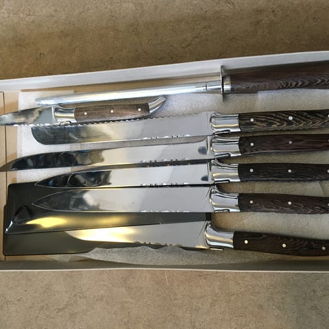 Fejlfri perfekt stand aldrig brugt kun hængt til pynt , så ønsker du et perfekt lækkert knivsæt så skal du slå til.