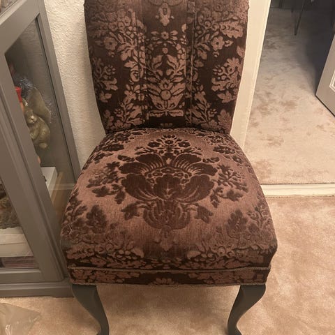 Polstret stol med hvidt sæde og ryglæn samt guldfarvet, udskåret træstel. Stolen har buede ben og dekorative detaljer på rammen. Egnet som spisebordsstol, side- eller pynte-stol i stue, soveværelse eller entré.