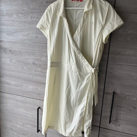 Fjällräven sommerkjole i str. M til dame. Kjolen er beige og fremstillet i polyamid. Modellen har slå-om effekt med bindebånd i siden, kortærmer og krave. Materialet er let og glat. Diskret Fjällräven-logo er broderet på brystet. Velegnet som let sommerkjole eller hverdagskjole.