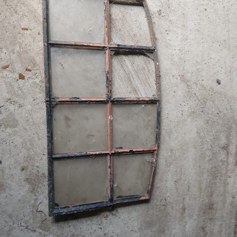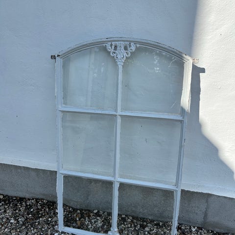 Gammelt buet vindue i jern med sprosser. Vinduet har flere felter med glas, hvor nogle ruder er hele og andre beskadigede eller mangler. Rammen er buet og viser rester af tidligere maling. Egnet til renovering, genbrug i byggeri eller som dekorativt element i indretning eller haveprojekter. Mål fremgår delvist af billederne med tommestok og kan bruges som reference ved opmåling.