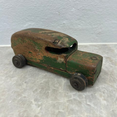 Legetøjsbil med hjul og ansigtsløsepersoner..