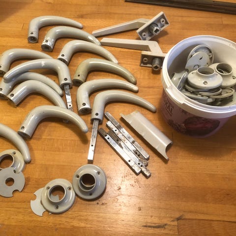 31 stk. gullige plastik skuffe- / dørhåndtag. Skruer og dækplader medfølger. Håndtagene måler 14 x 3 cm. Sælges samlet
