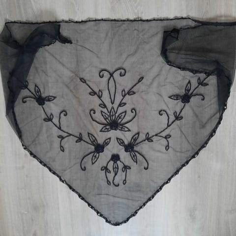 Sort strikket sjal med flæser. Billedet er dårlig kvalitet, sjalet er helt sort