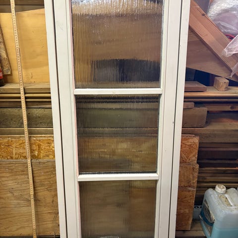 Vindue i hvidmalet træ med matteret glas. Rammen er rektangulær med to felter, hvor begge glasfelter er matterede for afskærmning af indkig. Vinduesrammen har beslag og håndtag i siden til åbning. Velegnet til fx bryggers, badeværelse eller andre rum, hvor der ønskes lysindfald uden fuldt indkig.