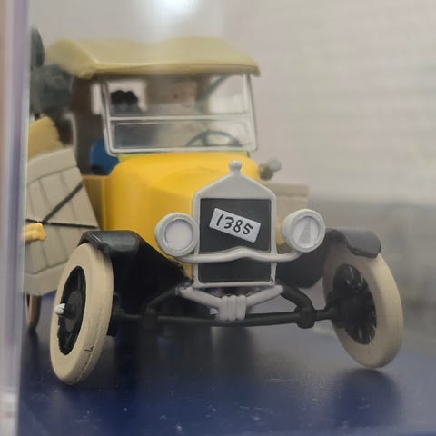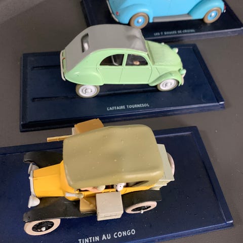 Tintin samlemodelbiler sæt bestående af flere biler fra Tintin-universet. Sættet omfatter blandt andet en rød Lincoln Zephyr, en lysegroen Citroën 2CV samt en gul cabriolet fra historien "Les 7 Boules de Cristal". Hver bil er monteret i en klar plastkasse med baggrundsmotiv fra tegneserierne og påtrykt serienavn på soklen. Egnet som samlerobjekt eller udstillingsmodel for Tintin-interesserede og modelbilsamlere.