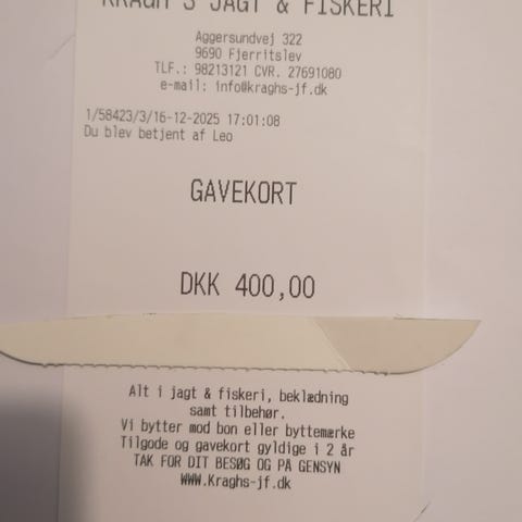 Gavekort på 400kr til kraghs jagt og fiskeri i 9690 Fjerritslev.