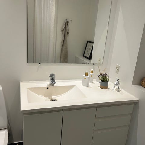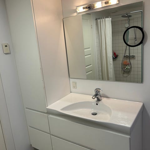 Fra ikke ryger hjem. Alder på badeværelsesmøblerne 9 år, men velholdt.