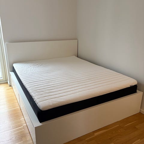 White IKEA king-size bed frame with storage (4 drawers), sold together with a king-size mattress. Mattress dimensions: 200 × 160 cm, 22 cm height