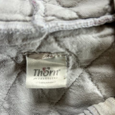 Thorn sovepose med ærmer og hætte med gennemgående lynlås foran. Soveposen har quiltet struktur og er dekoreret med mariehøner og blomster i røde, grønne og lyserøde nuancer på lys bund. Egnet til barn, hvor der ønskes ekstra varme omkring krop, arme og hoved. Materiale- og størrelsesangivelse fremgår ikke tydeligt af billederne.