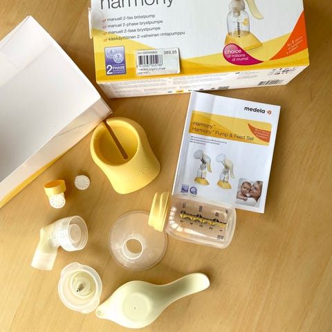 Medela Harmony brystpumpe sæt manuel, Sættet indeholder en manuel brystpumpe med håndtag, tragt og ventildele i plast, flaske med måleskala op til 150 ml, låg, brystskjolde i silikone med opbevaringsæsker samt tilbehør som holder/stand og ekstra smådele. Velegnet til udpumpning og opbevaring af modermælk til spædbørn.