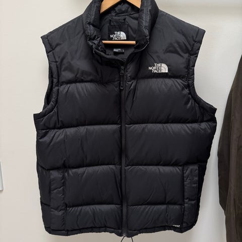 The North Face dunvest til herre i størrelse M. Vesten er sort og fyldt med dun, hvilket giver god isolering. Modellen har høj krave, gennemgående lynlås foran og sidelommer. Justerbar snøre forneden for bedre pasform. Velegnet som yderlag eller mellemlag i køligt vejr.