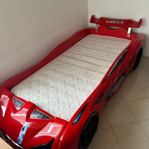 Racer børneseng udformet som en sportsbil i hvid farve. Sengen har integreret LED-lys langs sider og ved hjul, samt lys i fronten. Der medfølger fjernbetjening til styring af lysfunktionerne. Sengen er velegnet som juniorseng til børn, og madrassen ligger nedsænket i sengens ramme. På billederne ses mindre brugsspor på overfladen. Egnet til brug på børneværelse som sovemøbel og som tematiseret bilseng.