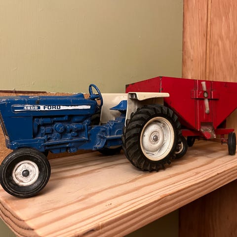 Gammel traktor i træ, mærket Hanse. Trælegetøj - se alle fotos.