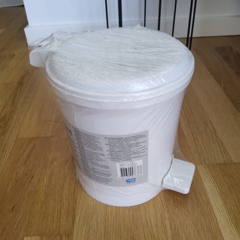 IKEA bathroom accessories set including a trash bin, toilet brush, soap dispenser, and toothbrush holder.