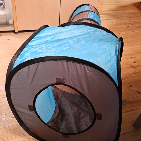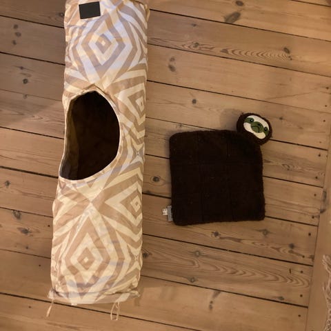 Katte el kanin tunnel til leg med mønstret yderstof i lyse nuancer og blød, brun fleeceforing indvendigt. Egnet til mindre katte, kaniner og mindre hunde eller hvalpe til leg i hjemmet. Kan rulles sammen for nem opbevaring.