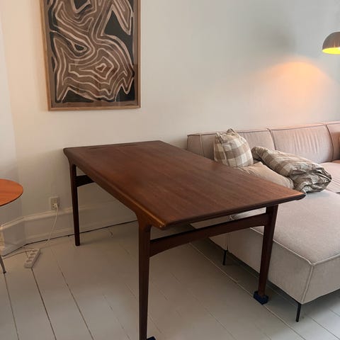 Dansk designet bord i teaktræ med hollandsk udtræk. Bordet står I pæn stand. Det er en stor model og er også mærket under. Det måler 130 cm i længden og kan forlænges med 55 cm pr udtræksplade. Det er 85 cm bredt og 76 cm højt. Stole er også til salg. # retro, teak, teaktræ, antik, vintage, bord, spisebord, dansk design, danish design, stol, stole.