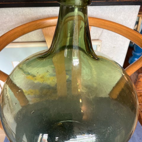 Smuk, stor gammel ballonflaske i grønt glas. Klassisk vinballon / demijohn med flot form og patina. Perfekt som gulvvase eller dekorativt element i stue, entré eller sommerhus.
