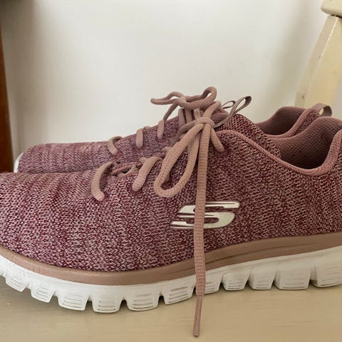 Skechers sneakers i str. 38. Modellen er i beige og hvid med snørelukning og kraftig sål. Egnet som hverdagssko eller fritidssko.