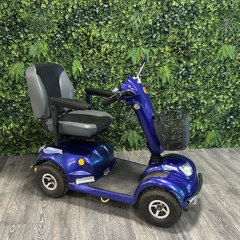 Apollo 915 el-scooter i rød med sort polstret sæde. Modellen har armlæn på begge sider af sædet og justerbar nakkestøtte. Scooteren er udstyret med tre hjul, fodplade i fuld længde og integrerede forlygter. Velegnet som elektrisk køretøj til persontransport på korte og mellemste afstande. Yderligere tekniske specifikationer som rækkevidde, batteritype og maksimal hastighed fremgår ikke af billederne.