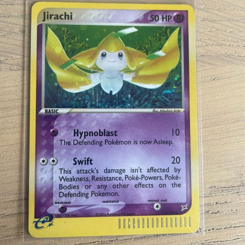 Pokémon Jirachi samlekort. Kortet viser Pokémonen Jirachi og er et standard Pokémon Trading Card Game kort. Velegnet til samling eller som del af et spil-sæt. Kortet opbevares i plastlomme på billedet, som kan beskytte mod slid under opbevaring og håndtering.