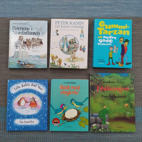 Samling af fire børnebøger i hardback. Pakken indeholder blandt andet titlerne "Gummi-Tarzan" af Ole Lund Kirkegaard, "Mis med de blå øjne" af Egon Mathiesen og "Folk og røvere i Kardemomme by" af Thorbjørn Egner. Bøgerne er illustrerede og velegnede som højtlæsning eller selvlæsning for børn. Alle bøger er på dansk.