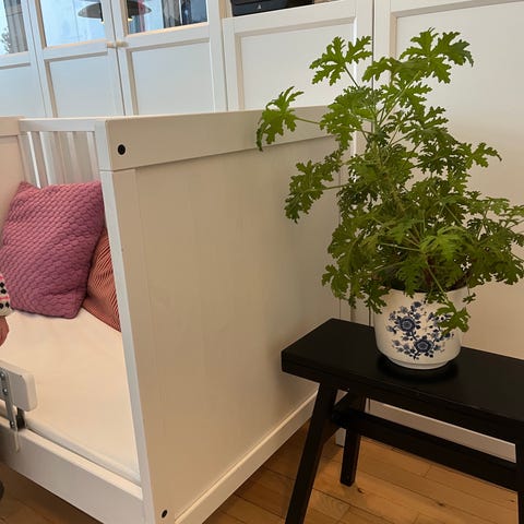 Desuden sidestykke med sengehest, så sengen kan bruges til lidt større børn. Sidestykket og sengehest er uoriginalt, men fungerer super.