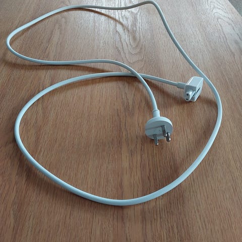 Voltex MP233 adapter- og forlængerkabel til en MacBook. Strømkabel med trebenet stikprop i den ene ende og apparatstik i den anden. Mærket med 10A 250V~.
