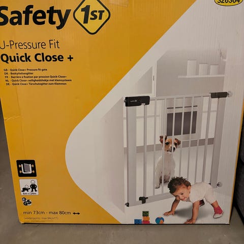 Hvidt sikkerhedsgitter til montering i døråbning eller gang. Gitteret har lodrette tremmer og åbning i den ene side med låsemekanisme øverst. Velegnet til at afskærme områder i hjemmet, f.eks. for små børn eller kæledyr. Fremstillet i metal med pulverlakeret overflade i hvid. Kan typisk spændes fast mellem to vægge eller karmes uden permanent montering, afhængigt af tilbehør og monteringsmetode