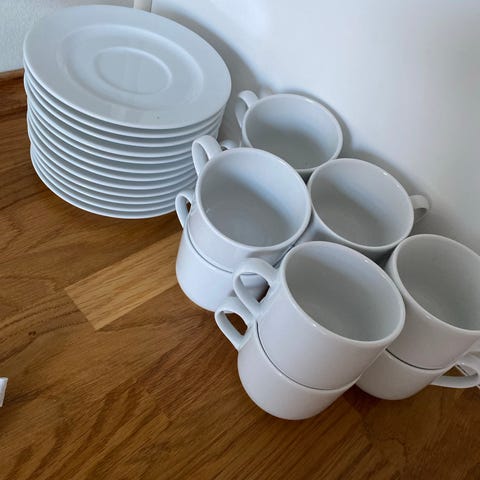 pillivuyt stel kopper og tallerkener grøn med guldkant