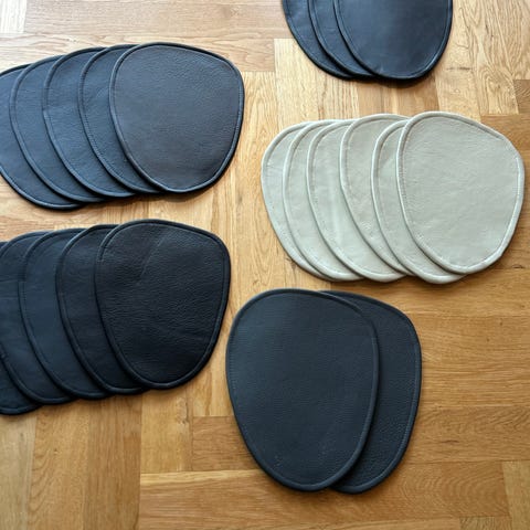 Jeg har kun de viste farver og størrelser tilbage. Smukke former og af kvalitetslæder. Skridsikker underlag så de ikke flytter sig under brug.
