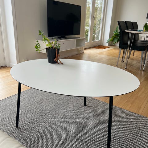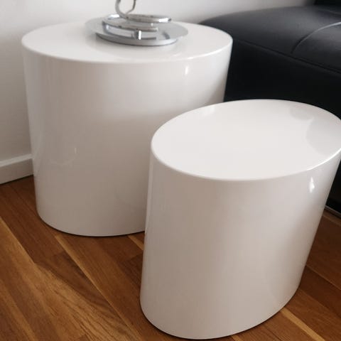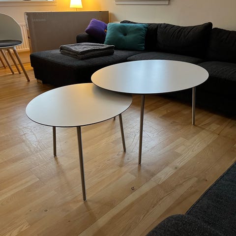 Ovalt sofabordssæt bestående af to borde i forskellig størrelse. Begge borde har hvid bordplade og slanke ben i metal. Bordene kan placeres sammen som sæt eller hver for sig som sofabord eller sidebord. Det lille bord har nogle små brugsspor.