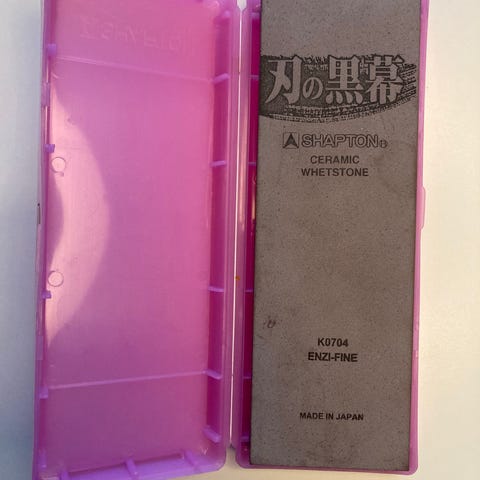 Shapton Pro 200 i fin stand. Kun brugt til en håndfuld knive som anden sten. Har ikke været planet med grovere sten endnu.