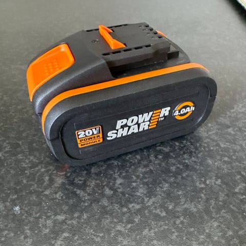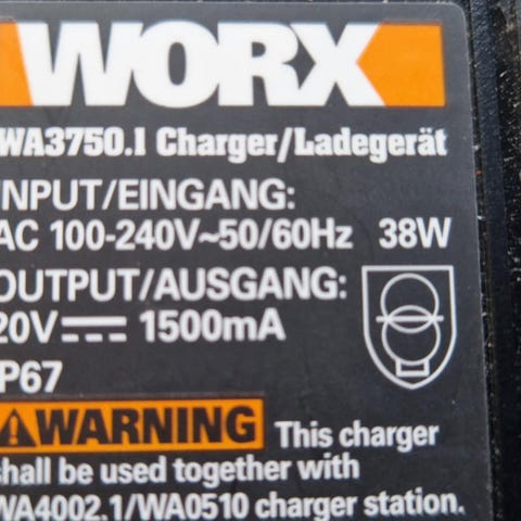 Worx WA3860 batterioplader med netkabel. Opladeren har input 100-240V, 50/60Hz, 50W og output 14,4-20V, 2,0A. Velegnet til opladning af kompatible Worx batterier til elværktøj. Enheden har indikatorlamper for opladningsstatus og ventilationsåbninger i huset. Sort plastkapsling med integreret holder til batteripakken.