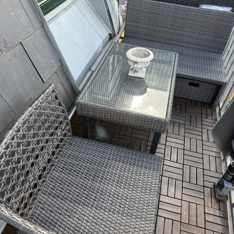 Fin altan sofa, med 2 skamler , der også kan fungerer som sidebord.