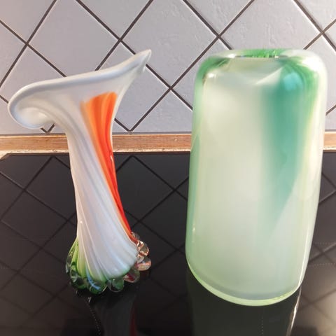 21 cm høje Murano vaser i hvid og grøn, med bund af lilla. Vaserne er mundblæste fra glasværket Murano, Venedig, Italien.