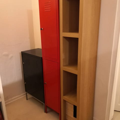 Vi har otte reoler med træskuffer til salg. Kender ikke designeren. De måler 128 høj, 80 bred og 45 dyb. De skal afhentes på Kongens Nytorv. Prisen er pr stk.