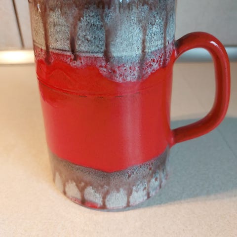 Karakteristisk cylinderformet krus med hank og dekoreret med en markant rød glassur.