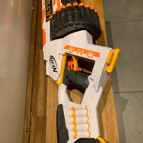 En mindre nerfgun som er klar til action.