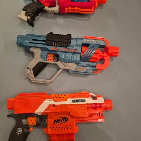 Nerf legetøjspistoler i blå og orange plast. Sættet består af to små håndholdte pistoler, velegnet som legetøj til børn. Pistolerne er designet til skud med skumprojektiler (darts), som ikke medfølger på billedet. Egnet til indendørs og udendørs leg, hvor børn kan lege fangeleg eller målskydning under opsyn af en voksen efter behov.