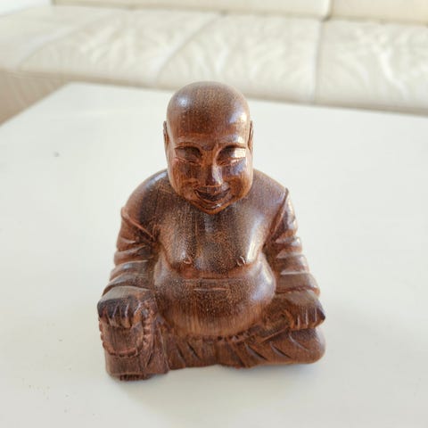 Buddha figur i brun træ. Figuren forestiller en siddende Buddha i meditationsstilling på sokkel med udskårne detaljer. Velegnet som dekorationsgenstand i hjemmet eller som del af en samling af orientalske eller religiøse figurer. Materialet fremstår som massivt træ med udskæringer for ansigt, hår og klædedragt på begge sider.