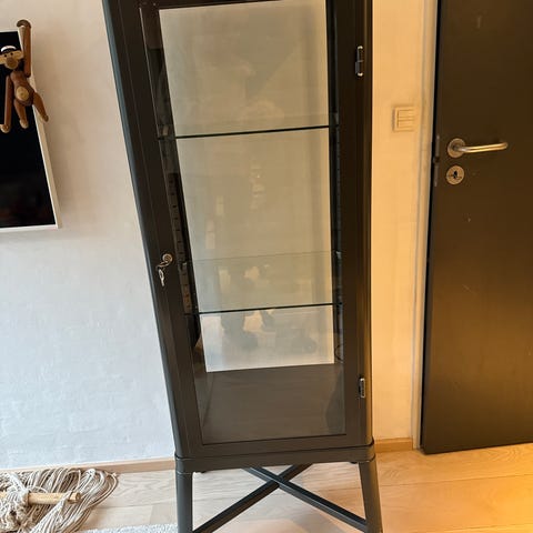 Et upcyclet køkkenskab fra Ikea. Jeg har brugt det som et vitrineskab i stuen. På bagsiden ses lidt lappeløsninger, men den er bundsolid og intet ses, når den er hængt op - hænger desuden rigtig fint. Med tre hylder. En messing kahytskrog, som jeg købte til skabet i Jem&Fix, kan medfølge.