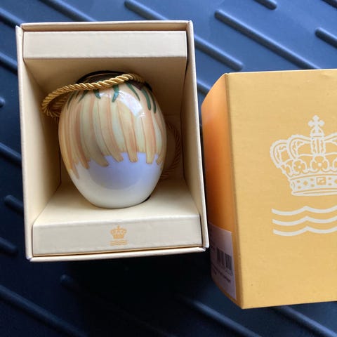 Royal Copenhagen The Spring Collection påskeæg i porcelæn. Ægget er dekoreret med blomsterlignende motiver i gule og rosa nuancer på hvid baggrund og har guldfarvet top med ophæng. Leveres i original æske med tekst om kollektionen. Velegnet som ophæng til påske- eller forårsdekoration i hjemmet.