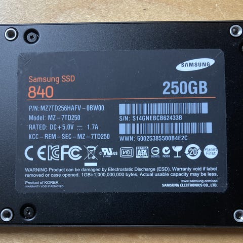 Sælger denne bundsolide Samsung 840 EVO SSD på 250 GB (240 GB brugbar kapacitet). Det er en af de mest driftsikre SSD-serier, Samsung har lavet, og den fungerer upåklageligt.