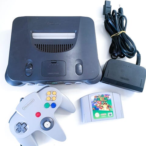 Nintendo controllers, transfer pak, rumble pak og strøm stik